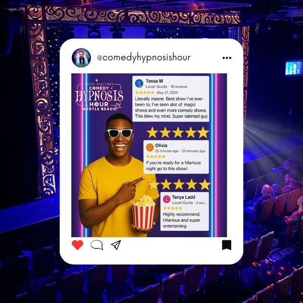 Maybe you had a Cabana by the pool. A few hours lounging in the sun never hurt anyone. Perhaps a stroll down at the beach. Now this is what I call Vacations Made Easy. You shopped TripAdvisor, and even googled Fun things to do for Adults in Myrtle Beach, or Fun Date Night Ideas in Myrtle Beach, or maybe even Comedy Clubs in Myrtle Beach. Now the sun is beginning to set and it's time to make your choice. Steve Falcon's Comedy Hypnosis Hour. The #1 Comedy Hypnotist Show in Myrtle Beach. Look at those reviews!